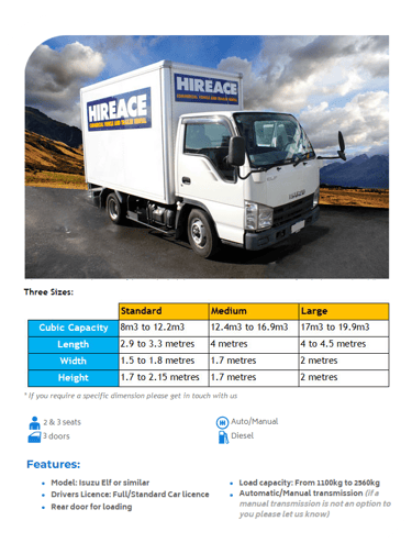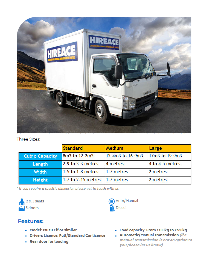 Hireace is a 100% Kiwi owned business, offering a diverse fleet of vehicles across 16 branches in New Zealand. Trucks, Vans, Minibuses, Utes and Trailers.